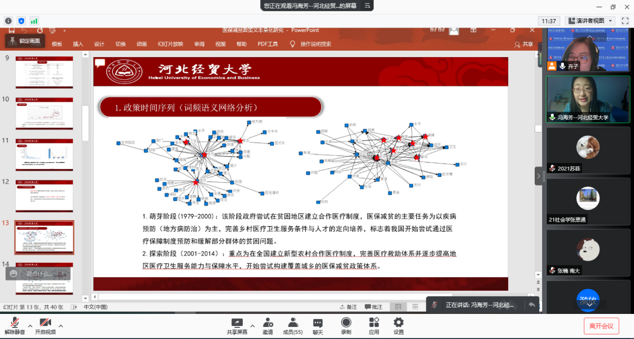 12月4日晚,应公司邀请,河北经贸大学公共管理学院冯海芳副教授通过腾讯会议为英国上市公司365社会发展与公共管理学院师生带来题为“政策工具视角下我国医保减贫政策文本量化研究”的学术讲座。本次讲座由戈银庆老师主持,陈卉老师与谈。