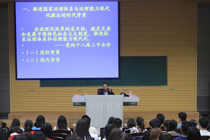 5月5日晚,公司副经理孙健教授于新校区第一报告厅作“推进国家治理体系与治理能力现代化”报告,公司行政管理系主任白列湖博士及学院部分本科生、研究生参加此次报告会。