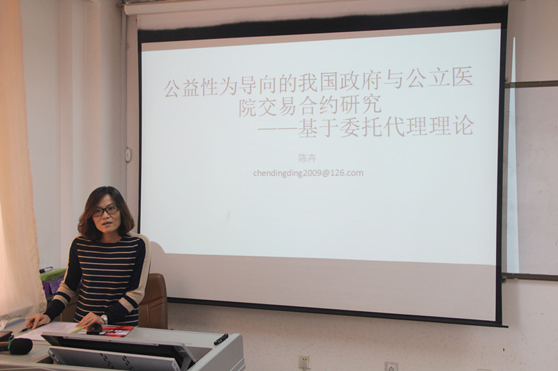陈卉博士从研究背景及前提条件、基本理论、研究方法、模型构建以及启示与思考五个方面做了报告。首先,她指出现阶段深化我国医疗体制改革的过程中依然要坚持公益性的发展道路,并且要同时发挥政府与市场的手段,走政府购买服务的道路。接着,她从经济学的角度指出政府购买服务中可以有补给供方和需方的两种手段,她从补给供方的角度出发依据两个发展阶段阐述了目前我国政府购买医疗服务还是主要依赖于公立医院。其次,她从研究的基本理论即委托代理理论确立了政府与公立医院之间的委托代理关系,同时指出政府与公立医院之间存在代理人的道德风险问题。接着,她用信息经济学中的分布函数的参数化方法通过构建模型来解决政府与公立医院存在的道德风险问题。再次,她阐述了通过模型的构建求解得出政府与公立医院之间基于公益性发挥的原则建立的最优合约应该满足的特征是什么,并且结合特征提出我国政府应该根据公立医院分级水平的不同建立不同的合约;建立符合公立医院特点的科学评价体系;完善公立医院的管理并应该制定对于公立医院激励约束条件的法律政策。最后,她提出了在此研究中还存在的不足和几点思考。她指出在实证分析中如何选取公立医院公益性的相关指标及有效的工具变量是此研究的重点和难点,同时也说明如何科学地对公立医院进行分级并建立相应的考核体系也是一个需要不断思考和关注的问题。