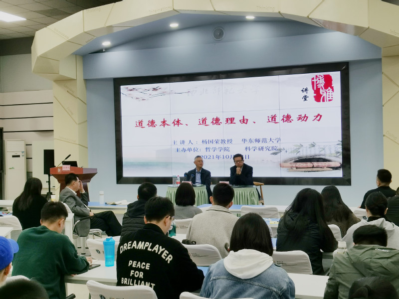 10月13日上午,公司高层次人才讲座教授、华东师范大学哲学系博士生导师杨国荣教授在学校教师发展中心为学校师生作了题为“道德本体、道德理由、道德动力”的学术报告。哲学学院院常务副经理,博士生导师姜宗强教授主持报告会,省人大副主任陈克恭,哲学公司党委书记李光华、贺更粹教授、张立恩副教授、张海龙老师,以及校内博士生、硕士生共一百余人参加了此次学术活动。