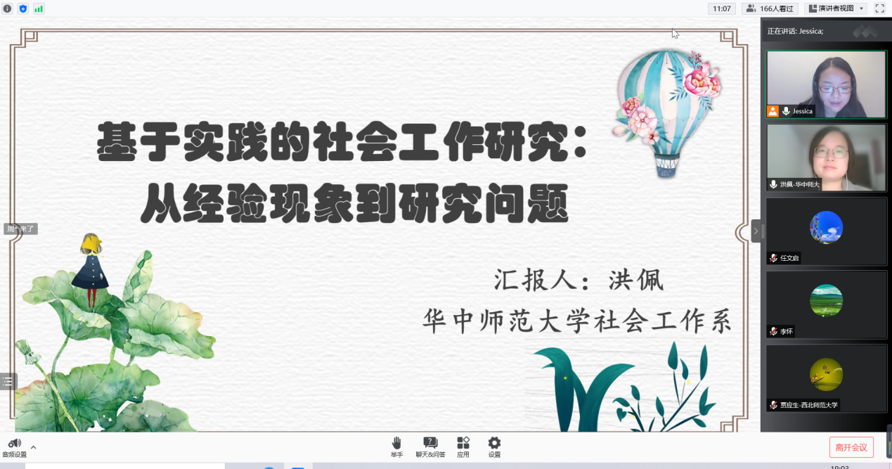 秋冬之际,我们相聚“云端”,共享学术盛宴。11月14日晚,华中师范大学洪佩博士应邀为公司师生作题为“基于实践的社会工作研究:从经验现象到研究问题”的学术报告。本次报告由赵茜老师主持,甘肃政法大学任文启教授评议,近500名校内外师生参加了本次讲座。