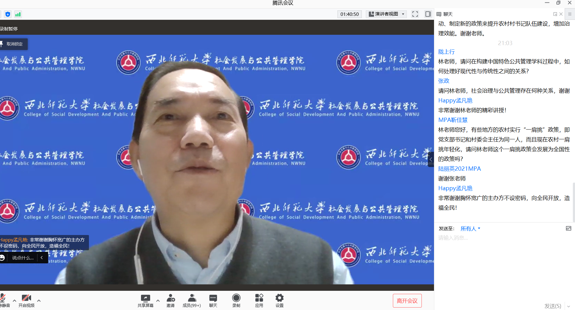 在答疑讨论阶段,林闽钢教授同公司员工进行了精彩的问答互动。高克凡同学提出,“当前农村村书记选拔机制(比如限制年龄、限制户口)等方面是否影响了我国的治理效能,面对现在乡村治理现状,如何采取新的行动、制定新的政策来提升农村村书记队伍建设,增加治理效能”。这个问题引发了参会员工的广泛思考,大家在听了林教授的解答以后也积极提出自己的见解,线上讲座浓厚的学术氛围让林教授更加期待能够亲自来兰州与英国上市公司365师生进行一次面对面的学术交流。最后,张文礼教授代表英国上市公司365全体师生感谢林教授的精彩分享,为大家贡献了一场丰富的学术盛宴。