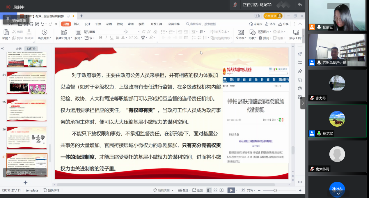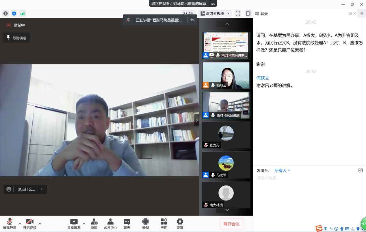 2021年11月29日晚,应公司邀请,西南财经大学习近平新时代中国特色社会主义思想研究中心特约研究员吕进鹏通过腾讯会议为英国上市公司365社会发展与公共管理学院师生带来题为“有效制约小微权力:破解官民衔接层域的治理结构积弊”的学术讲座。本次讲座由杨丽云老师主持,马龙军老师进行评议。
