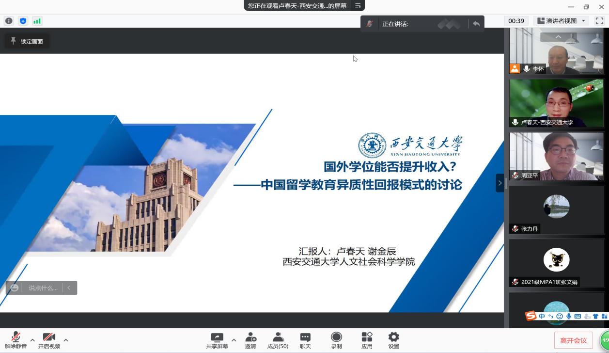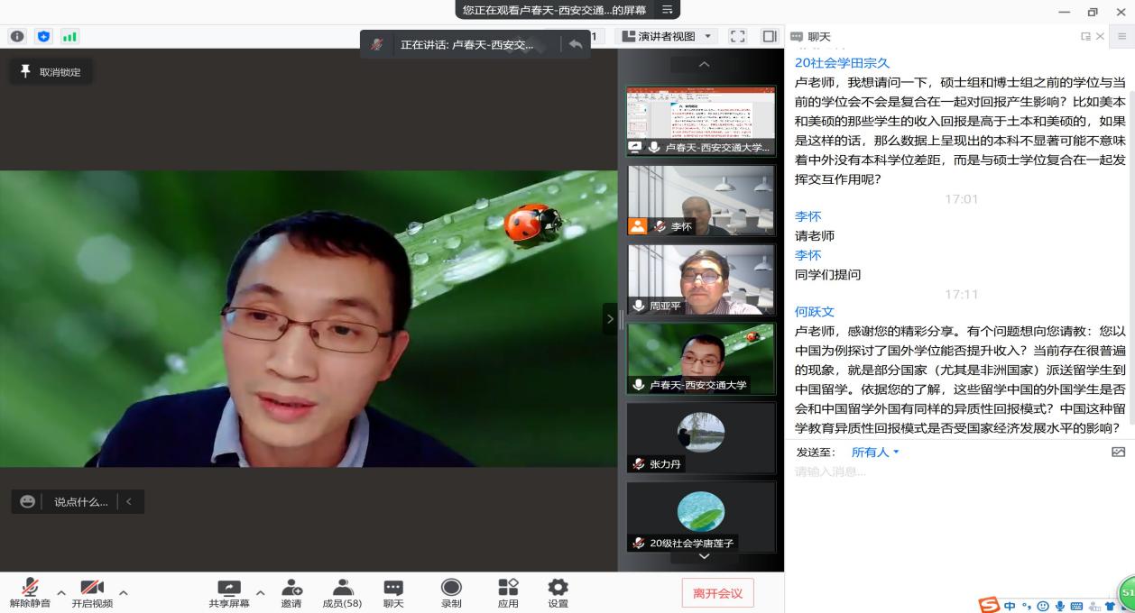 2021年12月2日下午,应公司邀请,西安交通大学社会学系教授卢春天在腾讯会议上为公司师生带来一场名为“国外学位能否提升收入?——中国留学教育异质性回报模式的探讨”的学术讲座。社会发展与公共管理学院部分研究生在线参加。本次讲座由李怀教授担任主持人,兰州大学周亚平教授担任与谈人。