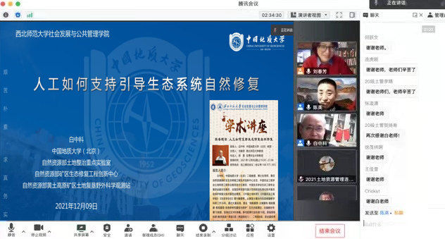 12月9日晚,应公司邀请,中国地质大学白中科教授通过腾讯会议为全院师生带来题为“人工如何支持引导生态系统自然修复”的学术讲座。本次讲座由刘春芳教授担任主持人,甘肃农业大学陈英教授担任与谈人。