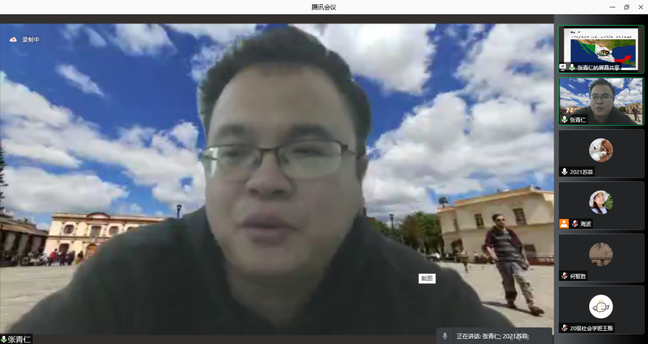 2021年12月11日晚,社会发展与公共管理学院邀请中央民族大学民族学与社会学学院副教授,国家民委区域国别基地“拉丁美洲社会文化中心”主任张青仁老师开展了一场题为“墨西哥恰帕斯印第安社区田野调查的经验与反思”的线上讲座。此次讲座由公司包海波老师主持,李秀英副教授担任与谈人,近百名校内外师生参与。讲座正式开始前,包海波老师简要的对人类学研究路径的独特之处以及到海外去做民族志研究的时代需求做了背景介绍。