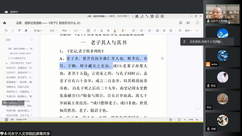 2021年12月8日,作为学校百廿校庆学术活动和学院“世界哲学日”系列讲座之一,深圳大学哲学系问永宁教授应邀通过腾讯会议为全校师生作了题为《“法家、道家还是道教——〈老子〉到底在说什么》的学术报告,哲学学院张海龙博士主持报告会。