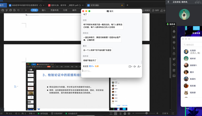 杜海涛老师的《批判性思维》课程,线上教学课堂氛围活跃。上图中,杜老师引导员工就老员工应不应该考研问题展开的讨论,员工互动比较热烈,并就考研问题专门为员工答疑。同时,借助于课堂教学内容让员工能够敏锐地进行批判性思考,以实现课程讲授目标。