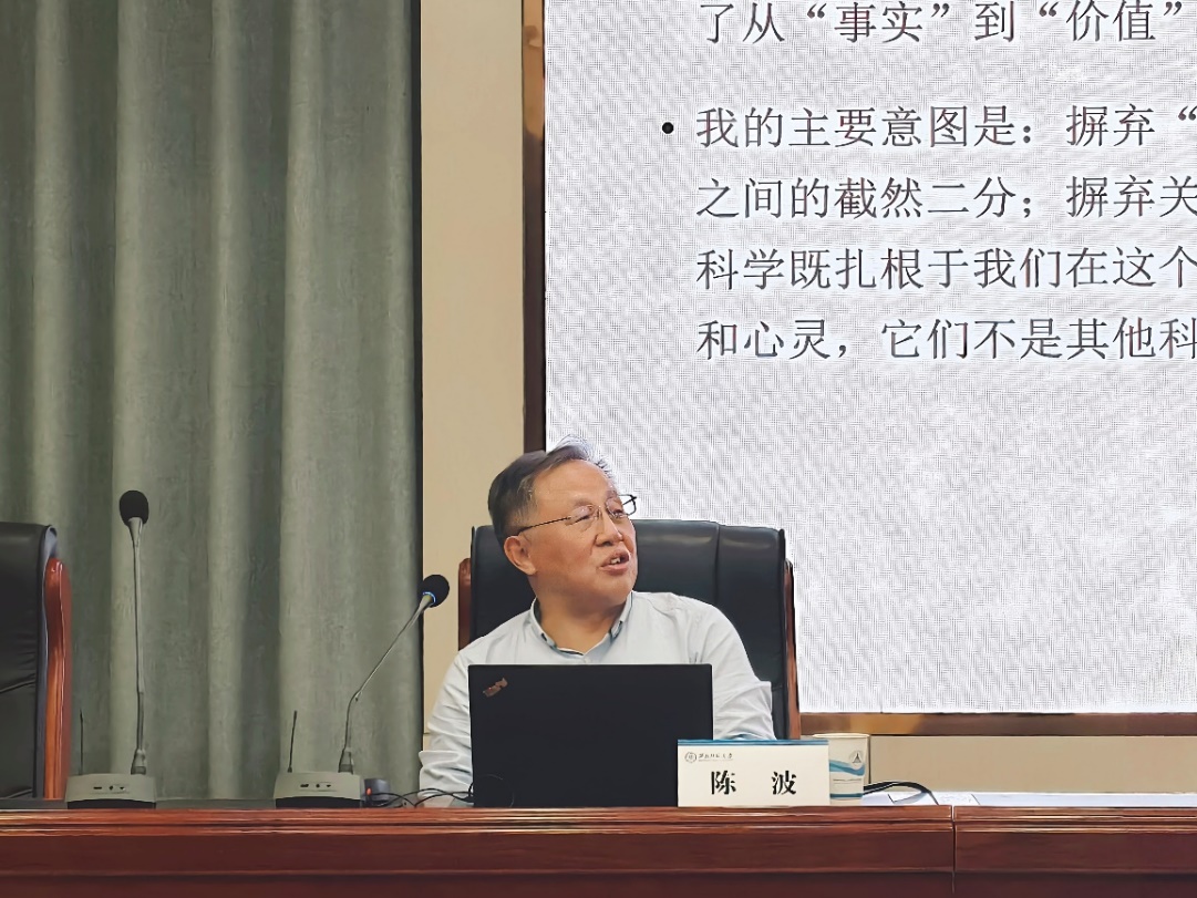陈波教授首先给出了讲座的主要观点和论证思路:休谟所提出的“是”与“应当”、“事实”与“价值”和“规范”之间的分裂和鸿沟是虚构的,因为没有纯客观的“事实”,事实有认知主体的主观介入;也没有纯主观的“规范”,规范必须有客观基础和学理依据。我们的需求、意图、目标把“是”与“应当”关联起来,架通了从“事实”到“价值”和“规范”的桥梁。