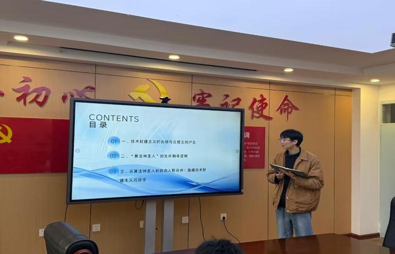 活动现场,议题研究组与科研成果组依次进行汇报,不同专业员工呈现了出各具特色的研究内容。如在议题研究组中,社会工作专业谢雯欣同学就农村初中生隐性辍学中同辈群体与手机网络的替偿机制展开研究,试图通过分析同辈群体和手机网络在社会化交互中的替偿机制,探讨他们是如何争夺员工的意义感。在科研成果组中,哲学专业侯雨辰同学以技术封建主义的出场与云领主的产生,算法神圣人的生命剥夺为线索探索从算法神圣人到自由人联合体的解放路径。这些前沿的学术议题不仅展现了汇报同学扎实的专业积累,还传递出了他们极具创新性的学术视野。