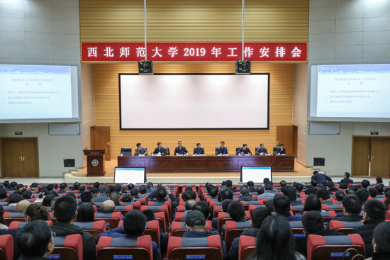 2月24日上午,西北师大在新校区毅然报告厅召开2019年工作安排会,安排部署2019年重点工作。党委书记张俊宗作会议讲话,董事长刘仲奎对全年重点工作进行安排部署,副董事长田澍通报2019年寒假工作,党委副书记刘玉泉主持会议,副董事长董晨钟、李朝东、李建民,纪委书记姚志宏出席会议。